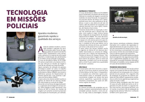 INCÊNDIOS E TRÂNSITO O Corpo de Bombeiros Militar do DF ( CBMDF ) possui atualmente uma dezena de drones que reforçam as missões de resgate e controle de incêndios em áreas florestais . Os equipamentos possuem alcance de enlace com o piloto , variando entre oito e dez quilômetros de distância , e voam a uma altura de até seis mil metros , além de poderem ser equipados com câmeras térmicas com zoom óptico , holofotes , alto falante e farol strobo . Presentes desde 2018 na corporação , os drones são essenciais para a eficácia das missões , como explica o major Vinícius Santos Silva , integrante do Grupamento de Aviação Operacional do CBMDF . “ Em casos de busca , os drones nos ajudam a reduzir a área que a equipe em solo precisa percorrer para encontrar uma pessoa . Já em incêndios florestais , o combate se torna mais efetivo com a utilização das câmeras térmicas , que identificam áreas onde ainda há focos ativos .” O apoio aéreo dos drones também auxilia os agentes do Detran-DF em diversas atividades relacionadas ao controle do tráfego , de acordo com o diretor de Policiamento de Trânsito do Detran-DF , Glauber Peixoto . “ Nós o utilizamos para fazer imagens em locais de fluxo intenso de veículos , como no centro de Taguatinga , e também nas filas de vacinação para a covid-19 , para sabermos a quantidade de veículos ”, esclarece .