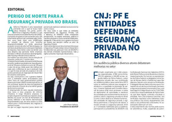 Formado atualmente por 2.466 empresas especializadas , 4.788 carros-fortes , 703.150 vigilantes e 246.809 armas , segundo dados da Polícia Federal , o setor de segurança privada deu sua contribuição em audiência pública nessa sexta-feira ( 30 / 7 ) sobre as melhores práticas para assegurar a eficiência e a qualidade na prestação do serviço . O evento realizado pelo Conselho Nacional de Justiça ( CNJ ) visou promover a coleta do depoimento de autoridades e membros da sociedade para esclarecimentos técnicos e jurídicos sobre a segurança privada no Brasil e como o setor observa os direitos humanos . São atividades de segurança privada : a vigilância patrimonial , o transporte de valores , a escolta armada e a segurança pessoal . Entre as 17 entidades habilitadas para a audiência , participaram os presidentes do SESVESP e da