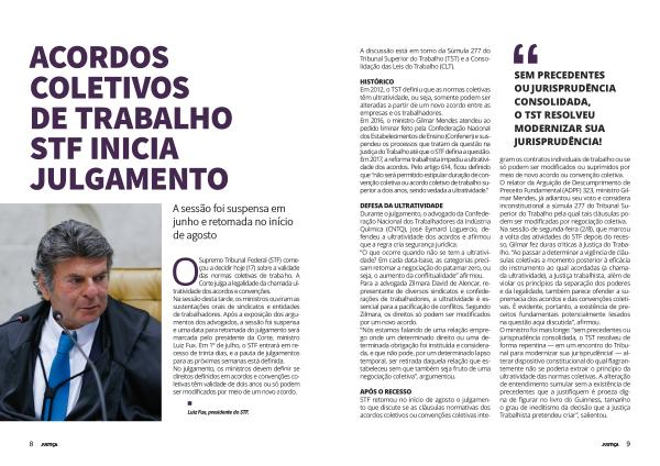 APÓS O RECESSO STF retomou no início de agosto o julgamento que discute se as cláusulas normativas dos acordos coletivos ou convenções coletivas integram os contratos individuais de trabalho ou se só podem ser modificados ou suprimidos por meio de novo acordo ou convenção coletiva . O relator da Arguição de Descumprimento de Preceito Fundamental ( ADPF ) 323 , ministro Gilmar Mendes , já adiantou seu voto e considera inconstitucional a súmula 277 do Tribunal Superior do Trabalho pela qual tais cláusulas podem ser modificadas por negociação coletiva . Na sessão de segunda-feira ( 2 / 8 ), que marcou a volta das atividades do STF depois do recesso , Gilmar fez duras críticas à Justiça do Trabalho . “ Ao passar a determinar a vigência de cláusulas coletivas a momento posterior à eficácia do instrumento ao qual acordadas ( a chamada ultratividade ), a Justiça trabalhista , além de violar os princípios da separação dos poderes e da legalidade , também parece ofender a supremacia dos acordos e das convenções coletivas . É evidente , portanto , a existência de preceitos fundamentais potencialmente lesados na questão aqui discutida ”, afirmou . O ministro foi mais longe : “ sem precedentes ou jurisprudência consolidada , o TST resolveu de forma repentina — em um encontro do Tribunal para modernizar sua jurisprudência ! — alterar dispositivo constitucional do qual flagrantemente não se poderia extrair o princípio da ultratividade das normas coletivas . A alteração de entendimento sumular sem a existência de precedentes que a justifiquem é proeza digna de figurar no livro do Guinness , tamanho o grau de ineditismo da decisão que a Justiça Trabalhista pretendeu criar ”, salientou .