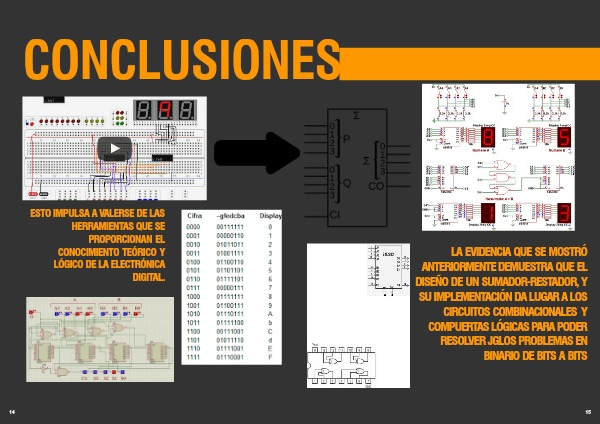 La evidencia que se mostró anteriormente demuestra que el diseño de un sumador-restador, y su implementación da lugar a los circuitos combinacionales y compuertas lógicas para poder resolver JGlos problemas en binario de bits a bits