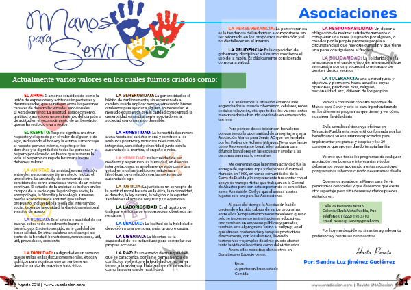 Pero porque deseo iniciar con los valores porque tengo la oportunidad de presentarte a esta Asociación Manos para Servir, AC que fue fundada por los Padres de Nohemí Márquez Tovar que funge como Representante Legal, ellos trabajan para difundir los valores en las escuelas y ayudar a las personas que más lo necesiten