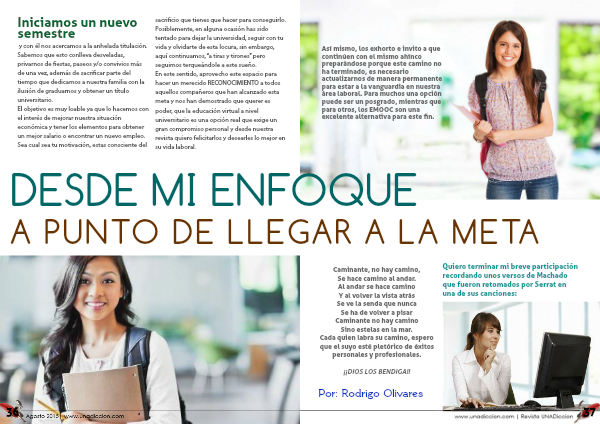 Así mismo, los exhorto e invito a que continúen con el mismo ahínco preparándose porque este camino no ha terminado, es necesario actualizarnos de manera permanente para estar a la vanguardia en nuestra área laboral. Para muchos una opción puede ser un posgrado, mientras que para otros, los EMOOC son una excelente alternativa para este fin.