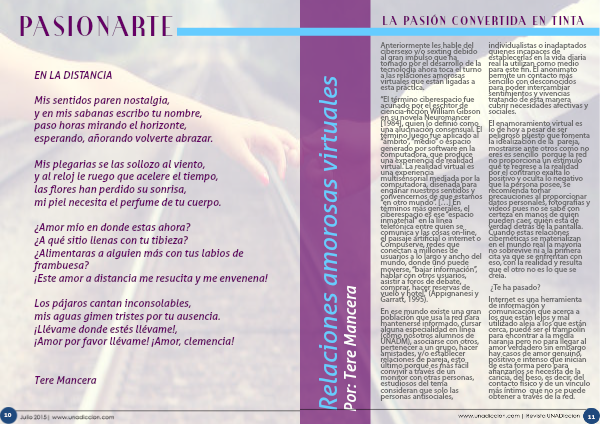 Internet es una herramienta de información y comunicación que acerca a los que están lejos y mal utilizado aleja a los que están cerca, puede ser el trampolín para encontrar a la media naranja pero no para llegar al amor verdadero sin embargo hay casos de amor genuino, positivo e intenso que inician de esta forma pero para afianzarlos se necesita de la caricia, del beso, es decir, del contacto físico y de un vínculo más íntimo que no se puede obtener a través de la red.