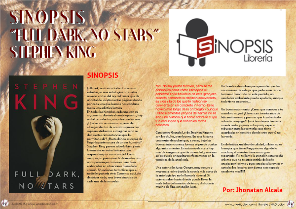 En definitiva, un libro de calidad, si bien no es lo mejor que tiene King pero es algo de lo mucho q el maestro tiene en su gran repertorio. Y si te llamo la atención esta reseña créeme que no te arrepentirás de leerlo gracias por leerme y pues gracias a la revista y ustedes los lectores por darme este espacio excelente mes!!!!!!