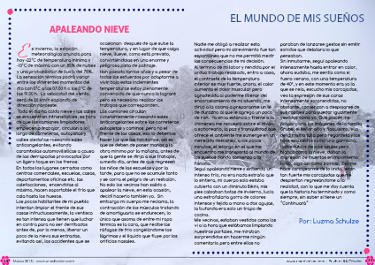 Seguí apaleando nieve y sintiendo un intenso frío, no era nada extraño que lo sintiera, mi cuerpo solo estaba cubierto con un diminuto Bikini, mis pies calzaban botas de invierno, lucía una estrafalaria gorra de colores intensos y tejida a mano a dos agujas, la bufanda era solo un trapo de cocina.
