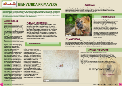 ¡Hola!, bienvenidos a la sección ANIMALAND. La Primavera esta ya en puerta y este es un comienzo de una nueva temporada entre tu y tu apresiado canino. Como en cualquier otra temporada del año, debes tomar precauciones con tu perro. Pese al buen clima, cuando lo saques afuera debes llevarlo con su correa, collar e identificación. Las vacunas de tu perro deben estar al día, nadie mejor que tu veterinario para informarte sobre esto. Lo que prosigue son algunos consejos para que lo pases de lo lindo esta primavera.