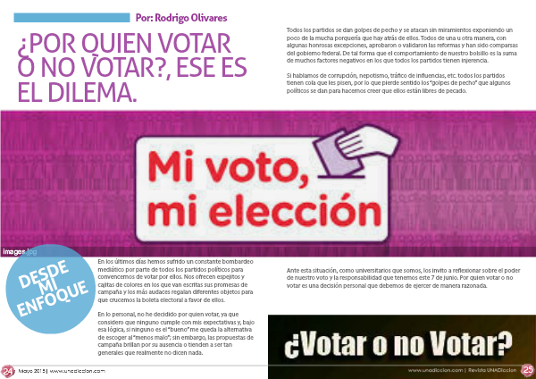 Ante esta situación, como universitarios que somos, los invito a reflexionar sobre el poder de nuestro voto y la responsabilidad que tenemos este 7 de junio. Por quien votar o no votar es una decisión personal que debemos de ejercer de manera razonada.