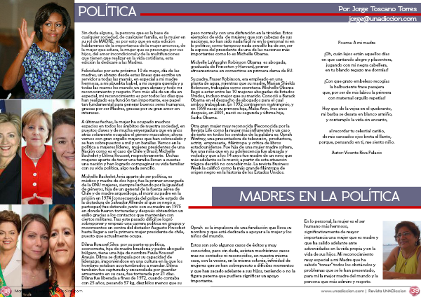 Sin duda alguna, la persona que es la base de cualquier sociedad, de cualquier familia, es la mujer en su rol de MADRE; es por esto que en esta edición hablaremos de la importancia de la mujer amorosa, de la mujer que educa, la mujer que se preocupa por sus hijos, del amor incondicional y de la multifunciones que tienen que realizar en la vida cotidiana, esta edición la dedicaré a las Madres.