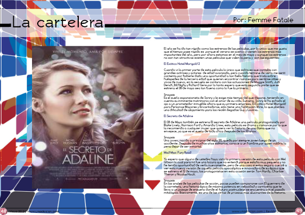 El 08 de Mayo también se estrena El secreto de Adaline una película protagonizada por Blake Lively, Harrison Ford y Amanda Crew, esta película es drama y romance por lo que la recomiendo a cualquier mujer que quiera ver la historia de una dama que no envejece, ya que es el sueño de toda chica después de los 30 años.