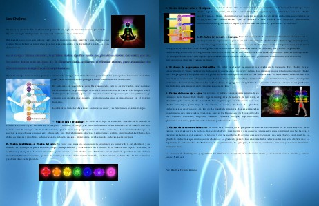 4.- El chakra del corazón o Anahata: Su color es el verde. Se encuentra ubicado en el centro del pecho y también representa el punto central de la seria de chakras. Este chakra rige la compasión, la armonía, la generosidad, el autocontrol y el amor. También puede ser representado por el color rosa que es el color del amor. Los organos que se relacionan con este chakra son: El corazón y los pechos. La glándula endocrina que controla es: La glandula timo. Las enfermedades que se asocian a este chakra cuando se encuentra bloqueado y/o desequilibrado son: Todo tipo de enfermedades relacionadas con el corazón, problemas relacionados con el sistema inmunologico, alergias y cancer de mama. 5.- El chakra de la garganta o Vishuddha: Su color es el azul. Se encuentra ubicado en la garganta. Este chakra rige el conocimiento, la salud, la desición, la lealtad, la confianza, el tacto y la calma. Los organos que se relacionan con este chakra son: La garganta y los pulmones. La glándula endocrina que controla es: La tiroides. Las enfermedades relacionadas con este chakra cuando esta bloqueado son: Enfermedades de la Tiroides( hipotiroidismo e hipertiroidismo), asma , bronquitis, problemas de audicición, úlceras de la boca, dolor de garganta, amigdalitis. La anorexia nerviosa, aunque es un problema multichakra, esta mayormente conectada a este chakra. 6.- Chakra del tercer ojo o Ajna: Su color es el Indigo. Se encuentra localizada en el medio de la frente. Este chakra rige la inteligencia, la audacia, la intuición, el idealismo y la busqueda de la verdad. Los organos que se relacionan con este chakra son: Ojos, parte baja de la cabeza, la nariz y la boca. La glandula endocrina que controla este chakra es: La glandula pituitaria. Las enfermedades relacionadas con este chakra cuando se encuentra bloqueado y/o desequilibrado son: Cefalea tensional, migraña, defectos visuales, miopía, hipermetropía, glaucoma, cataratas, problemas de sinusitis, problemas de oido. 7.- Chakra de la corona o Sahasrara: Su color es el violeta y/o el púrpura. Se encuentra localizado en la parte superior de la cabeza. Este chakra rige la belleza, la creatividad y la inspiración y nos conecta con nuestro guia espiritual, con las fuerzas y energías superiores, con nuestro yo interno y con la sabiduría. El organo que se relacionan con este chakra es el cerebro. La glandula endocrina que controla este chakraes: La glandula pineal. Las enfermedades relacionadas con este chakra son: La depresion, la enfermedad de Parkinson, la esquizofrenia, la epilepsia, Alzheimer, confusion, mareos y muchos trastornos mentales más. La manera de desbloquear y equilibrar los chakras es mediante la meditación diaria y así mantener una mente y cuerpo sanos. Namasté!
