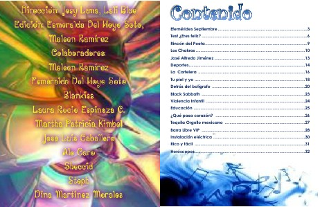 Efemérides Septiembre .............................................................................3 Test ¿Eres feliz? ...........................................................................................6 Rincón del Poeta ........................................................................................9 Los Chakras ..............................................................................................10 José Alfredo Jiménez ..............................................................................13 Deportes ....................................................................................................14 La Cartelera ............................................................................................16 Tu piel y yo ...............................................................................................18 Detrás del bolígrafo ................................................................................20 Black Sabbath .........................................................................................23 Violencia Infantil .....................................................................................24 Educación ................................................................................................25 ¿Qué pasa corazón? .............................................................................26 Tequila Orgullo mexicano .....................................................................27 Barra Libre VIP .........................................................................................28 Instalación eléctrica ...............................................................................30 Rico y fácil ...............................................................................................31 Horóscopos ...............................................................................................32