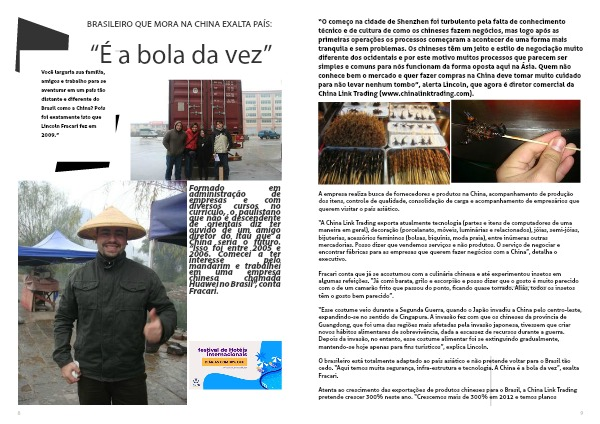 “O começo na cidade de Shenzhen foi turbulento pela falta de conhecimento técnico e de cultura de como os chineses fazem negócios, mas logo após as primeiras operações os processos começaram a acontecer de uma forma mais tranquila e sem problemas. Os chineses têm um jeito e estilo de negociação muito diferente dos ocidentais e por este motivo muitos processos que parecem ser simples e comuns para nós funcionam da forma oposta aqui na Ásia. Quem não conhece bem o mercado e quer fazer compras na China deve tomar muito cuidado para não levar nenhum tombo”, alerta Lincoln, que agora é diretor comercial da China Link Trading (www.chinalinktrading.com).