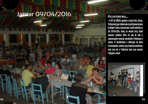 A APP da EEBIAS agradece a todos (Pais, Alunos, Professores) que colaboraram e participaram da janta (Cardápio: Galeto, macarronada e purê) realizada no dia 09/04/2016. Ainda, no mesmo local, foram expostos trabalhos feitos em sala de aula e, apresentações musicais envolvendo Professores e Alunos. O envolvimento e dedicação de todos (Churrasqueira, cozinha, copa, limpeza) transformou, mais uma vez, a Tradicional Janta num sucesso! Obrigado a todos!