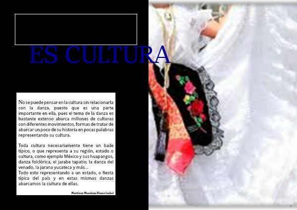 No se puede pensar en la cultura sin relacionarla con la danza, puesto que es una parte importante en ella, pues el tema de la danza es bastante extenso abarca millones de culturas con diferentes movimientos, formas de tratar de abarcar un poco de su historia en pocas palabras representando su cultura.