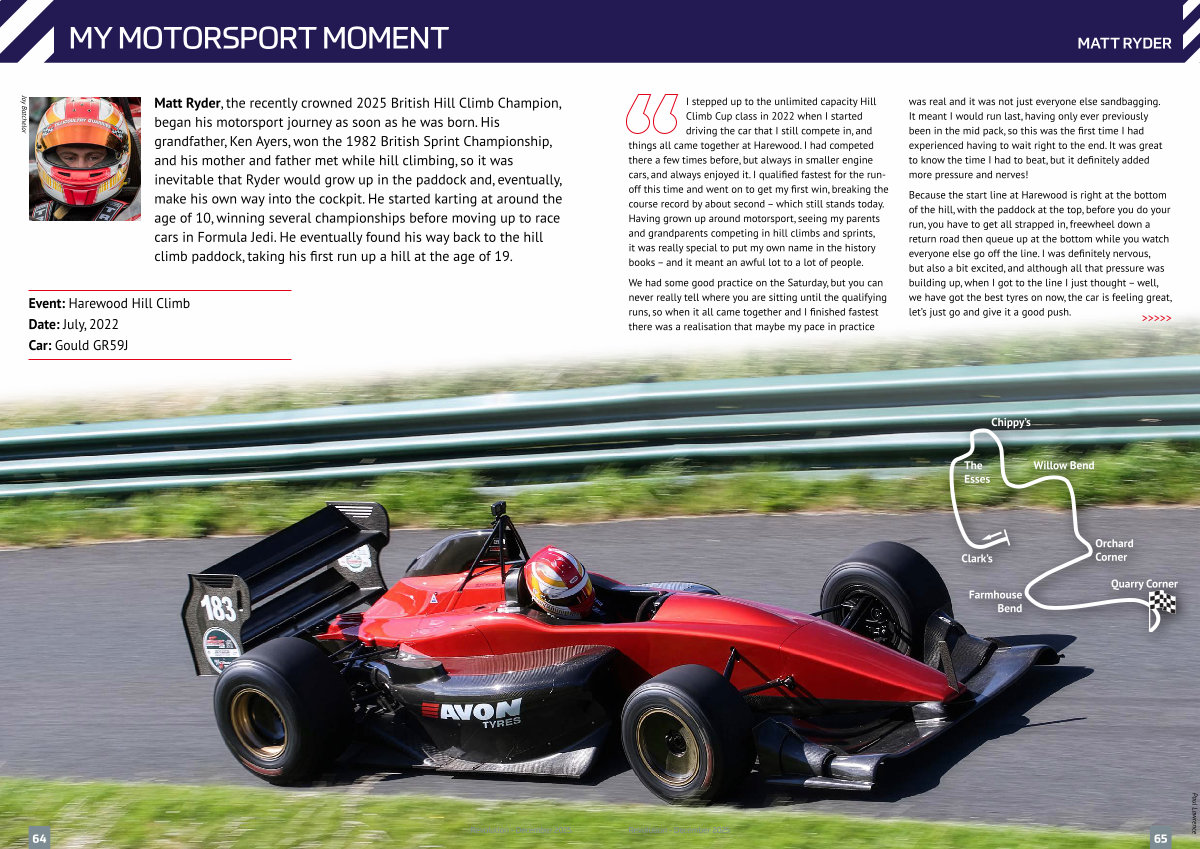 Matt Ryder, the recently crowned 2025 British Hill Climb Champion, began his motorsport journey as soon as he was born. His grandfather, Ken Ayers, won the 1982 British Sprint Championship, and his mother and father met while hill climbing, so it was inevitable that Ryder would grow up in the paddock and, eventually, make his own way into the cockpit. He started karting at around the age of 10, winning several championships before moving up to race cars in Formula Jedi. He eventually found his way back to the hill climb paddock, taking his first run up a hill at the age of 19.