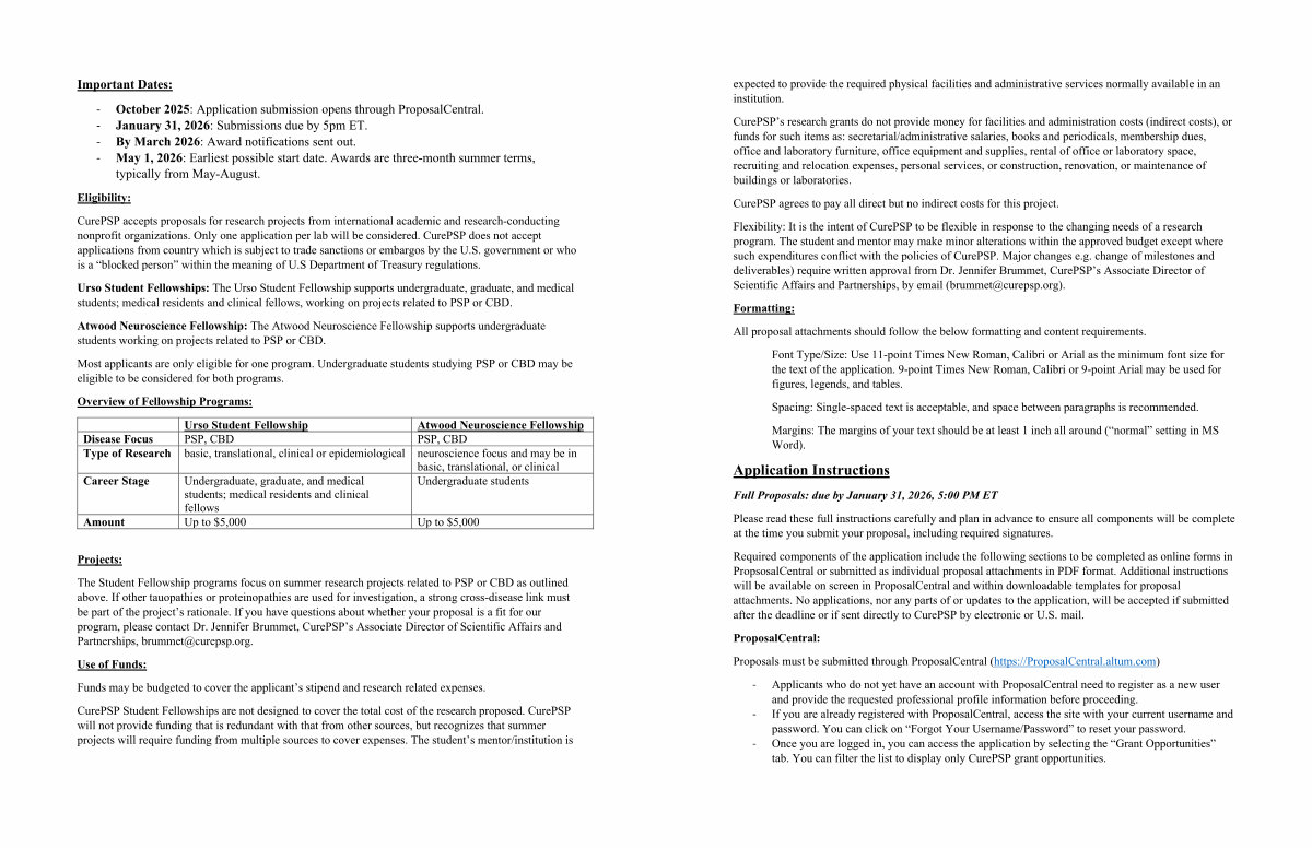The Student Fellowship programs focus on summer research projects related to PSP or CBD as outlined above. If other tauopathies or proteinopathies are used for investigation, a strong cross-disease link must be part of the project’ s rationale. If you have questions about whether your proposal is a fit for our program, please contact Dr. Jennifer Brummet, CurePSP’ s Associate Director of Scientific Affairs and Partnerships, brummet @ curepsp. org.