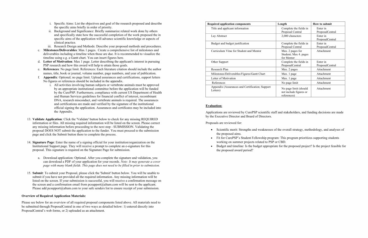 i. Specific Aims: List the objectives and goal of the research proposed and describe the specific aims briefly in order of priority. ii. Background and Significance: Briefly summarize related work done by others and specifically state how the successful completion of the work proposed the in specific aims of the application will advance scientific knowledge or aspects of clinical practice. iii. Research Design and Methods: Describe your proposed methods and procedures. c. Milestones / Deliverables: Max 1 pages. Create a comprehensive list of milestones and deliverables including a timeline when those are due. It is recommended to visualize the timeline using e. g. a Gantt chart. You can insert figures here. d. Letter of Motivation: Max 1 page. Letter describing the applicant ' s interest in pursuing PSP research and how this award will help to attain those goals. e. References: No page limit. References: Each literature citation should include the author names, title, book or journal, volume number, page numbers, and year of publication. f. Appendix: Optional; no page limit. Upload assurances and certifications, support letters