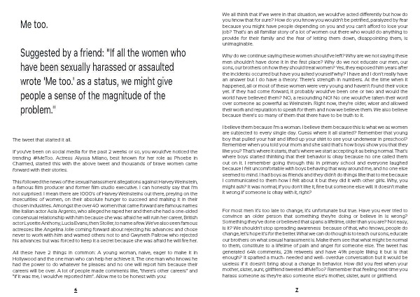 If you've been on social media for the past 2 weeks or so, you would've noticed the trending #MeToo. Actress Alyssa Milano, best known for her role as Phoebe in Charmed, started this with the above tweet and thousands of brave women came forward with their stories.