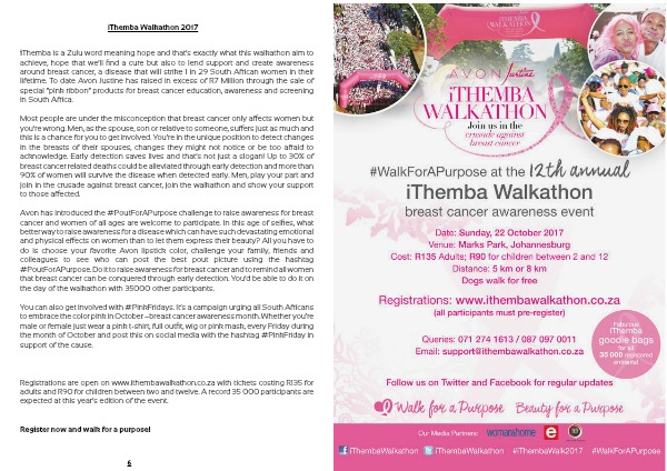 iThemba is a Zulu word meaning hope and that’s exactly what this walkathon aim to achieve, hope that we’ll find a cure but also to lend support and create awareness around breast cancer, a disease that will strike 1 in 29 South African women in their lifetime. To date Avon Justine has raised in excess of R7 Million through the sale of special “pink ribbon” products for breast cancer education, awareness and screening in South Africa.