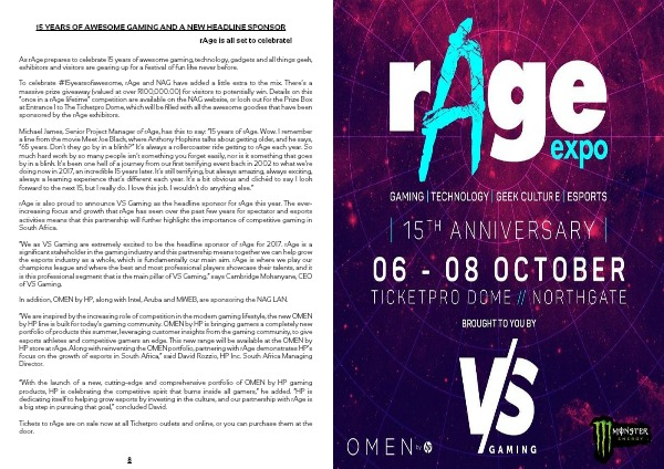 rAge is also proud to announce VS Gaming as the headline sponsor for rAge this year. The ever-increasing focus and growth that rAge has seen over the past few years for spectator and esports activities means that this partnership will further highlight the importance of competitive gaming in South Africa.