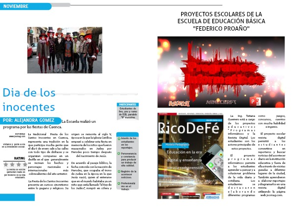 El proyecto escolar revista digital permitió a los estudiantes convertirse en reporteros y buscar noticias del acontecer diario en la institución educativa y fuera de ella a través de visistas guiadas a diferntes lugares de la ciudad, También aprendieron a elaborar reportajes y diagramarlos en una revista digital utilizando la página web joomag.com.