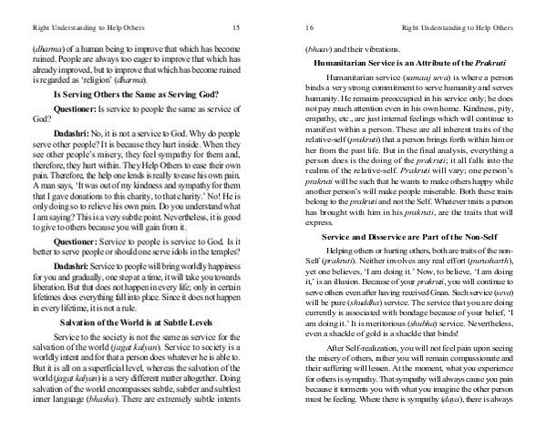 Helping others or hurting others, both are traits of the non- Self( prakruti). Neither involves any real effort( purusharth), yet one believes,‘ I am doing it.’ Now, to believe,‘ I am doing it,’ is an illusion. Because of your prakruti, you will continue to serve others even after having received Gnan. Such service( seva) will be pure( shuddha) service. The service that you are doing currently is associated with bondage because of your belief,‘ I am doing it.’ It is meritorious( shubha) service. Nevertheless, even a shackle of gold is a shackle that binds!
