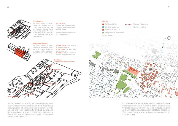 This diagram identifies the role of the circulation atrium towards the overall site circulation. Pedestrians are able to directly access various points on site, while experiencing a dramatically visual, symbolic, and social passage within the South Building. This design move has declared a tight bond with the development of Church Street, which is seen as the connection to the Cleveland community and experience.