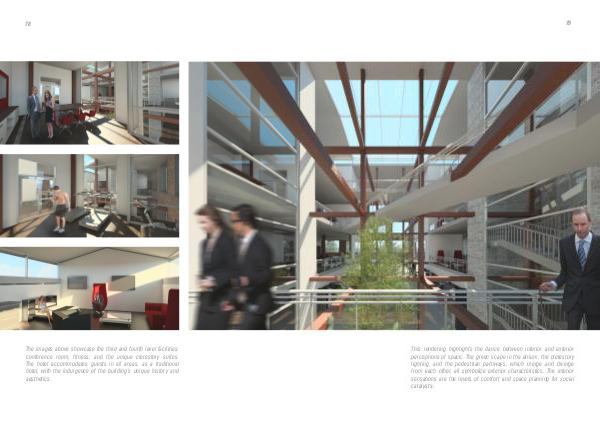 This rendering highlights the dance between interior and exterior perceptions of space. The green scape in the atrium, the clerestory lighting, and the pedestrian pathways, which merge and diverge from each other, all symbolize exterior characteristics. The interior sensations are the levels of comfort and space planning for social catalysts.