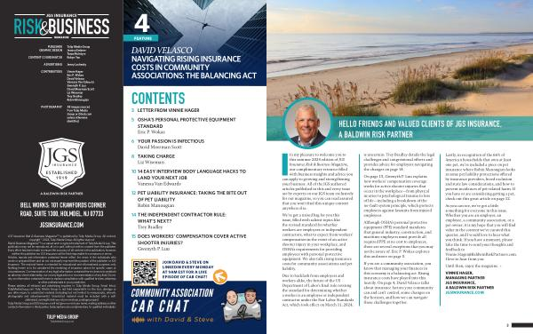 It ’ s my pleasure to welcome you to this summer 2024 edition of JGS Insurance Risk & Business Magazine , our complimentary resource filled with business insights and advice you can apply to growing and strengthening your business . All of the JGS authored articles published in this and every issue are by experts on our JGS team exclusively for our magazine , so you can read assured that you won ' t find this unique content anywhere else .