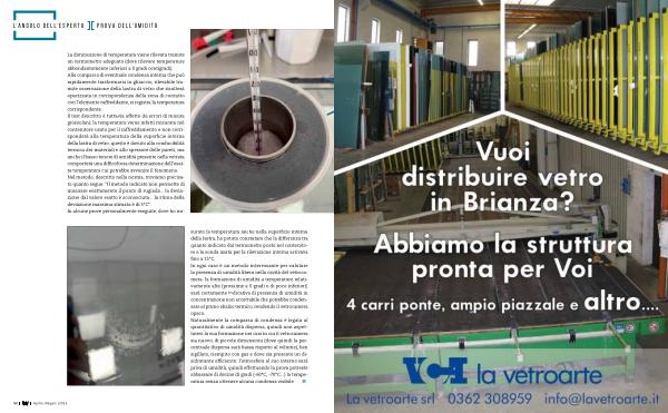 La diminuzione di temperatura viene rilevata tramite un termometro adeguato ( deve rilevare temperature abbondantemente inferiori a 0 gradi centigradi ). Alla comparsa di eventuale condensa interna che può rapidamente trasformarsi in ghiaccio , rilevabile tramite osservazione della lastra di vetro che risulterà opacizzata in corrispondenza della zona di contatto con l ’ elemento raffreddante , si registra la temperatura corrispondente . Il test descritto è tuttavia affetto da errori di misura grossolani ; la temperatura viene infatti misurata nel contenitore usato per il raffreddamento e non corrisponderà alla temperatura della superficie interna della lastra di vetro : questo è dovuto alla conducibilità termica dei materiali e allo spessore delle pareti , ma anche il basso tenore di umidità presente nella vetrata comporterà una difficoltosa determinazione dell ’ esatta temperatura cui potrebbe avvenire il fenomeno . Nel metodo , descritto nella norma , troviamo precisato quanto segue : “ Il metodo indicato non permette di misurare esattamente il punto di rugiada ... la deviazione dal valore esatto è sconosciuta ... la stima della deviazione massima stimata è di 5 ° C ”. In alcune prove personalmente eseguite , dove ho misurato la temperatura anche nella superficie interna della lastra , ho potuto constatare che la differenza tra quanto indicato dal termometro posto nel contenitore e la sonda usata per la rilevazione interna arrivava fino a 15 ° C . In ogni caso è un metodo interessante per valutare la presenza di umidità libera nella cavità del vetrocamera : la formazione di umidità a temperature relativamente alte ( prossime a 0 gradi o di poco inferiori ) sarà certamente indicativa di presenza di umidità in concentrazione non accettabile che potrebbe condensare al primo sbalzo termico , rendendo il vetrocamera opaco . Naturalmente la comparsa di condensa è legata al quantitativo di umidità dispersa , quindi non aspettatevi la sua formazione nei casi in cui il vetrocamera sia nuovo , di piccole dimensioni ( dove quindi la percentuale dispersa sarà bassa rispetto al volume ), ben sigillato , riempito con gas e dove sia presente un disidratante efficiente : l ’ atmosfera al suo interno sarà priva di umidità , quindi effettuando la prova potreste abbassare di decine di gradi ( -60 ° C , -70 ° C ...) la temperatura senza ottenere alcuna condensa visibile .