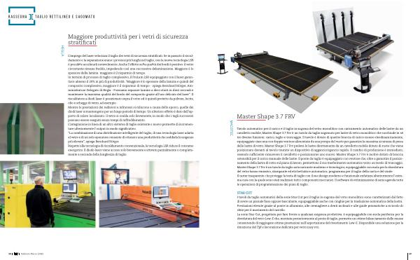 Tavolo automatico per il carico e il taglio in sagoma del vetro monolitico con caricamento automatico delle lastre da un cavalletto mobile , Master Shape 3.7 Frv è un tavolo da taglio sagomato per lastre di vetro monolitico che racchiude in sé tre diverse funzioni : carico , taglio e troncaggio . Il tavolo è dotato di quattro braccia di carico mosse oleodinamicamente , equipaggiate ciascuna con doppie ventose alimentate da una pompa del vuoto per garantire la massima sicurezza di presa delle lastre di vetro . Master Shape 3.7 Frv preleva le lastre direttamente da un cavalletto mobile dotato di ruote che viene posizionato davanti al tavolo tramite un dispositivo di aggancio / sgancio rapido . Il cambio di produzione è immediato , essendo sufficiente rimuovere il cavalletto e posizionarne uno nuovo . Master Shape 3.7 Frv è inoltre dotato di braccia estensibili per il carico manuale delle lastre . Il ponte da taglio è equipaggiato con ventose che , oltre a garantire il posizionamento della lastra di vetro sul piano di lavoro , permettono il suo trasferimento automatico verso un tavolo di troncaggio . Master Shape 3.7 Frv è un tavolo da taglio autocaricante moderno e tecnologico , equipaggiabile con mola per la sbordatura del vetro basso emissivo , stampante ed etichettatrice automatica , programma per il taglio della carta e del vinile . Il carter trasparente che protegge la testa di taglio con il suo design moderno e funzionale enfatizza ulteriormente l ’ estrema cura con la quale sono stati realizzati tutti i componenti meccanici . Il software di ottimizzazione di serie agevola tutte le operazioni di programmazione dei piani di taglio .