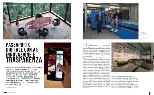 U n gemello digitale che tramite un QR Code applicato sul prodotto riporterà tutte le informazioni utili per il B2B e per il consumatore finale : il processo produttivo , la provenienza delle materie prime e la documentazione di sostenibilità . Una vera e propria carta d ’ identità del prodotto che risponde alle esigenze dell ’ Unione Europea , degli intermediari e dei consumatori . È questo il progetto nato dalla collaborazione tra EZ Lab , impresa padovana specializzata nella tecnologia Blockchain che tramite la propria piattaforma Made in Block valorizza e protegge le filiere Made in Italy , e Nardo Vetro , azienda situata nella provincia di Venezia che progetta , produce e installa soluzioni in vetro per il settore dell ’ industria , dell ’ arredamento di interni , navale e del trasporto . Il nuovo DPP - Digital Product Passport , o Passaporto Digitale di Prodotto , realizzato dalla PMI padovana garantisce la trasparenza dei processi e del Made in Italy per i prodotti della storica azienda vetraria . Fondata nel 1970 a Camponogara ( VE ) dall ’ intuizione di Giorgio Nardo , oggi ottantaquattrenne ancora attivo in azienda , Nardo Vetro combina tradizione artigianale a innovazione tecnologica . Oggi a guidare l ’ azienda insieme al padre sono i quattro figli Gianluca , Antonio , Fausto e Alberto , che continuano a investire in macchinari all ’ avanguardia , capitale umano e intelligenza artificiale per guidare l ’ azienda verso il futuro .