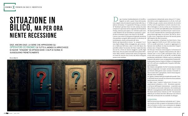 D opo il primo bombardamento di tariffe a tappeto su tutti o quasi i Paesi del mondo, sono seguiti attacchi mirati in particolare alla Cina; e adesso nel mirino c’ è soprattutto l’ Europa, accusata di“ derubare” gli Stati Uniti. Se tutti credono di avere compreso la speciale tattica negoziale del Presidente Trump, nessuno può sapere con certezza quali sono i reali obiettivi che la Casa Bianca si propone, e quindi dove si fermerà il gioco dei rilanci( o dei bluff). L’ unica cosa certa è la situazione di grande incertezza che paralizza i progetti delle aziende e le decisioni di investimento, anche nel mondo del vetro. Mentre gli imprenditori stanno“ in campana” in attesa degli sviluppi della sceneggiatura, gli economisti si dedicano full time a fare i conti dei danni che potrebbe subire l’ economia dei Paesi colpiti dai dazi ma anche, e forse in misura maggiore, quella degli Stati Uniti, che nei primi mesi dell’ anno prima dell’ i- nizio delle ostilità commerciali stava proseguendo un trend di crescita che il resto dei Paesi sviluppati poteva solo invidiare.