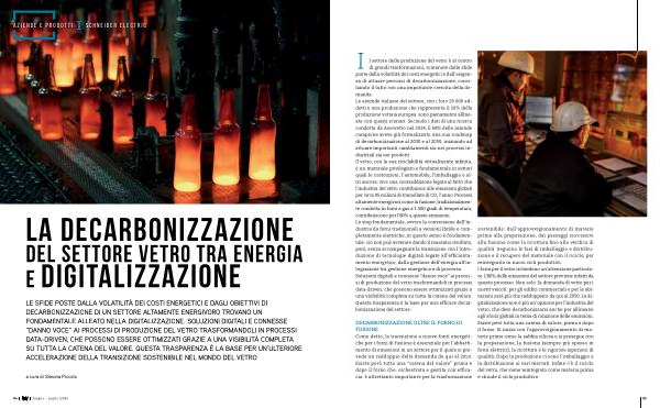 I l settore della produzione del vetro è al centro di grandi trasformazioni, scatenate dalle sfide poste dalla volatilità dei costi energetici e dall’ esigenza di attuare percorsi di decarbonizzazione, conciliando il tutto con una importante crescita della domanda. Le aziende italiane del settore, con i loro 29.000 addetti e una produzione che rappresenta il 16 % della produzione vetraia europea, sono pienamente allineate con questi scenari. Secondo i dati di una ricerca condotta da Assovetro nel 2024, il 68 % delle aziende campione aveva già formalizzato una sua roadmap di decarbonizzazione al 2030 e al 2050, iniziando ad attuare importanti cambiamenti sia nei processi industriali sia nei prodotti. Il vetro, con la sua riciclabilità virtualmente infinita, è un materiale privilegiato e fondamentale in settori quali le costruzioni, l’ automobile, l’ imballaggio e altri ancora; vive una contraddizione legata al fatto che l’ industria del vetro contribuisce alle emissioni globali per circa 95 milioni di tonnellate di CO 2 l’ anno. Processi altamente energivori come la fusione, tradizionalmente condotta in forni a gas a 1.500 gradi di temperatura, contribuiscono per l’ 80 % a queste emissioni. Lo step fondamentale, ovvero la conversione dell’ industria da forni tradizionali a versioni ibride e completamente elettriche, in questo senso è fondamentale: ciò non può avvenire dando il massimo risultato, però, senza accompagnare la transizione con l’ introduzione di tecnologie digitali legate all’ efficientamento energetico, dalla gestione dell’ energia all’ integrazione tra gestione energetica e di processo. Soluzioni digitali e connesse“ danno voce” ai processi di produzione del vetro trasformandoli in processi data-driven, che possono essere ottimizzati grazie a una visibilità completa su tutta la catena del valore. Questa trasparenza è la base per una efficace decarbonizzazione del settore.
