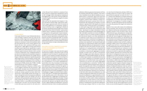 radiazione infrarossa generata internamente nel forno da resistenze elettriche ( forni radianti ), o forni dove il vetro è riscaldato da aria calda che lambisce la sua superficie ( forni a convezione ), oppure forni misti dove sono presenti entrambe le modalità di riscaldamento . In genere , a parità di altre condizioni , il tempo di riscaldamento ( necessario a portare tutto il vetro uniformemente alla temperatura di tempra ) in un forno radiante è superiore del 25-30 % rispetto ad un forno a convezione pura . Tuttavia più lento è il riscaldamento , ovvero più a lungo resta il vetro nella camera di riscaldamento , più uniforme sarà la temperatura nella lastra . Questo però va sempre attentamente valutato per limitare le deformazioni causate dall ’ appoggio sui rulli o altri difetti causati da un eccessivo riscaldamento . Quanto al vetro , se è colorato assorbe la radiazione più velocemente rispetto a uno chiaro ( similmente se si confronta un vetro chiaro con uno extrachiaro ) e la presenza di smalti o rivestimenti ( coating ) può modificare drasticamente il processo . Di particolare importanza sono soprattutto i secondi , poiché gli smalti presentano un comportamento simile al vetro rispetto alla radiazione infrarossa che tipicamente è il mezzo di apporto del calore verso la lastra . Secondo una regola generale , se il coating determina un ’ emissività del vetro inferiore a 0.14-0.15 può essere utilizzato solo un sistema a convezione per raggiungere un risultato ottimale , in quanto sotto i 450-500 ° C il rivestimento riflette la maggior parte della radiazione infrarossa . Nella pratica è anche possibile temprare un vetro basso emissivo ( per esempio con emissività di 0.01 ) anche con un forno a radiazione se il manufatto è di piccole dimensioni , ma il risultato finale come qualità ottica e planarità non sarà mai come quello raggiungibile con un riscaldamento a convezione . Tenendo conto che la tendenza è quella di temprare lastre sempre più grandi , che superano anche i 3x12 m , il riscaldamento a convezione è l ’ unica alternativa . Un ulteriore aspetto da tenere presente è l ’ inerzia termica del forno e si deve fare assolutamente attenzione che l ’ introduzione del vetro nella camera di riscaldamento non vada a ridurre la temperatura della stessa ; per questo la potenza del riscaldamento va opportunamente sovradimensionata . Più è grande la lastra , più la massa di vetro introdotta nel forno andrà a ridurne inizialmente la temperatura . Va anche tenuta in conto l ’ eventuale suddivisione dei vetri che sono caricati nel forno : se si prende in considerazione l ’ area utile di riscaldamento di un forno , per esempio 2.0x4.2 m e si carica il forno con vetri di piccole dimensioni , diciamo 30x50 cm , è possibile inserire da 35 pezzi ( 7 file da 5 pezzi ) a 48 pezzi ( 8 file da 6 pezzi ) per un totale di 5.25 m 2 o 7.2 m 2 . Il tempo di riscaldamento e l ’ energia richiesta per lo stesso sono largamente inferiori se paragonati al riscaldamento di una lastra unica di pari estensione superficiale . Di conseguenza , il consumo energetico del forno è correlato allo spessore del vetro da lavorare ma anche alla pezzatura dei singoli vetri immessi in camera . Quando il vetro entra nella camera di riscaldamento inizia ad assorbire calore secondo tre meccanismi : ( i ) per radiazione ( infrarossa ) sostanzialmente sulla sua superficie essendo il vetro di silicato sodico calcico sufficientemente opaco alla radiazione corrispondente a temperature di 600-700 ° C ( radiazione infrarossa dell ’ ordine dei 3 µ m di lunghezza d ’ onda ); ( ii ) per conduzione nelle zone di contatto con i rulli del forno ; ( iii ) per convezione con la massa d ’ aria presente nel forno eventualmente forzata a lambire la superficie del vetro mediante ventilatori ( come nei forni a radiazione standard ) o soffiata contro il vetro mediante veri e propri ugelli ( come nei forni a convezione ). Non poche sono le problematiche associate al riscaldamento . Per esempio , se il riscaldamento per conduzione tra rulli e vetro è eccessivo quest ’ ultimo tende ad espandere nelle zone di contatto e in generale sulla superficie inferiore , andando a generare una curvatura verso l ’ alto della lastra ; di conseguenza la stessa verrà a trovarsi appoggiata su un numero più limitato di rulli e la concentrazione del carico può portare a danneggiamenti del vetro o a deformazioni nell ’ area di contatto che a volte risultano in effetti ottici localizzati ( effetto lente ) e altri inestetismi . Il riscaldamento risulta ancora più asimmetrico quando vengono sottoposti a tempra vetri rivestiti ( per esempio basso emissivi o selettivi ) che riflettono la radiazione infrarossa . In tal caso , anche tenendo conto della conduzione tra rulli e vetro , è assolutamente necessario aumentare l ’ apporto di energia sulla superficie superiore ( quella rivestita ) attraverso getti di aria calda ; questa deve tuttavia essere particolarmente massiva per compensare la radiazione sul lato opposto ( di solito , in un forno a pura convezione , si dimensiona il sistema in modo da mettere in moto durante il ciclo di riscaldamento una massa d ’ aria calda pari a circa otto volte il peso del vetro ). Un ulteriore problema che si incontra nella tempra di vetri rivestiti nasce dal fatto che per alcune applicazioni le zone di bordo non sono rivestite ( in genere il coating è rimosso
