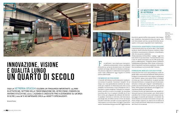 FORMAZIONE, MERCATO E IPOTESI FUTURE Il mercato del vetro non è solo produzione: molto dipende dalla conoscenza del materiale. Molti privati si rivolgono ai serramentisti senza sapere esattamente cosa chiedere; spesso sono questi ultimi a rivolgersi al vetraio per avere informazioni. Le grandi aziende sono più strutturate e consapevoli, i piccoli serramentisti invece restano più“ artigiani”. Inevitabilmente, si profila una trasformazione del settore: pochi grandi vetrai, molti posatori specializzati, una maggiore concentrazione delle forze produttive. La Vetreria Stucchi, pur mantenendo una squadra interna per la posa su lavori privati o per clienti storici, considera che in futuro la posa sarà sempre più appannaggio di aziende specializzate: un’ azienda che vuole investire in una linea vetrocamera non può allo stesso tempo comprare un camion da un milione di euro con gru da 50 metri. Nella forza economica risiede il futuro di un’ azienda.
