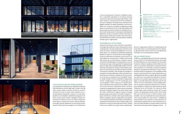 e le zone di esposizione. Scrivanie e scaffalature modulari e componibili organizzate in un sistema articolato assicurano la privacy necessaria per ogni attività e, nello stesso tempo, la conformazione di alcove multifunzionali e per socializzare. Gli impianti sono schermati da un grigliato metallico di stampo industriale, anch’ esso modulare, che consente una rapida riconfigurazione degli spazi e la manutenzione. Non c’ è nulla di predefinito nel layout proprio per potersi adattare ai cambiamenti lavorativi anche del personale e alle esigenze individuali dei dipendenti. Il piano di copertura assume la funzione di piazza sospesa, inedita per il contesto, che è stata valorizzata dall’ intervento artistico di Lorenzo Mason e dedicata al relax, al gioco e agli incontri.