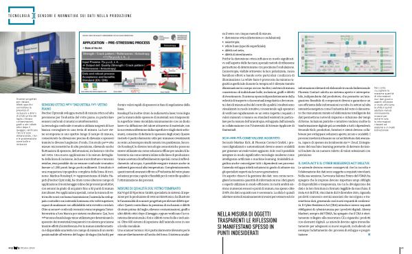 MISURE DI QUALITÀ SUL VETRO TEMPRATO Kai Vogel di Viprotron GmbH, specialista in sistemi di ispezione per la produzione di vetro architettonico, ha illustrato le funzionalità di scanner progettati per rilevare difetti specifici. Questi controllano la presenza di inclusioni e difetti di strato prima del taglio, rilevano contaminazioni, graffi e altri difetti ottici dopo il lavaggio, oppure verificano l’ accuratezza dimensionale, i fori e i difetti come bolle e inclusioni. Oltre 600 sistemi di ispezione dell’ azienda sono in uso a livello mondiale. Uno scanner termico 5G è particolarmente rilevante per le misure direttamente all’ uscita del forno. Il sistema analiztecnologia Sensori e normativa sui dati nella produzione