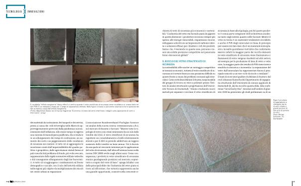 IL RICICLO DEL VETRO STRATIFICATO DI SICUREZZA La sostenibilità offre anche un vantaggio competitivo in termini economici, tuttavia il vetro stratificato di sicurezza si è trovato finora in una posizione difficile su questo fronte a causa dei problemi connessi agli intercalari. Come sottolinea Miriam Schuster, Responsabile del gruppo di ricerca su vetro e polimeri presso l’ Istituto di analisi strutturale e progettazione dell’ Università Tecnica di Darmstadt,“ stiamo studiando nuovi metodi per separare e riciclare il vetro stratificato di sicurezza in base alla tipologia, poiché questo prodotto è ormai parte integrante dell’ architettura moderna tanto negli interni quanto nelle facciate. Mentre il vetro in teoria è un materiale totalmente riciclabile, e anche il PVB degli intercalari in linea di principio può essere riciclato dato che è un materiale termoplastico, la realtà quotidiana è tutt’ altro che confortante. Mentre infatti la maggior parte dei vecchi elementi in vetro stratificato di sicurezza viene frantumata e i frammenti di vetro vengono trasferiti ad altri settori, ad esempio per la produzione di lana di vetro o vetro cavo, la maggior parte dei residui di PVB viene invece smaltita in discarica o incenerita. La separazione del vetro dall’ intercalare ha rappresentato finora il principale ostacolo a un vero ciclo di riciclo o riutilizzo”. Il team di ricercatori guidato da Miriam Schuster e dal Prof. Johannes Kuntsche del Dipartimento di ingegneria strutturale dell’ Università di scienze applicate di Darmstadt( h _ da) ha raccolto questa sfida. Alla conferenza“ CircuClarity One”, tenutasi nell’ ambito di glasstec 2024 ha presentato gli studi preliminari su di un