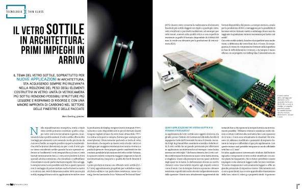 QUALI APPLICAZIONI DEL VETRO SOTTILE SI STANNO STUDIANDO? Le applicazioni del vetro sottile sono oggetto di ricerca, tra gli altri, presso l’ Istituto di Costruzioni Edili della Facoltà di Ingegneria Civile dell’ Università Tecnica di Dresda. Secondo il Dipl. Ing. Daniel Pfarr, assistente scientifico della facoltà, il vetro sottile ha un grande potenziale per affermarsi in applicazioni architettoniche ad esempio come lastra interna nei vetri tripli.“ Chi finora riteneva che il vetro sottile si deformasse fortemente se usato come lastra interna, si sbagliava. Grazie alla pressione isocora quasi uniforme degli spazi tra le lastre, le deformazioni dovute ai carichi climatici sono trascurabili rispetto agli impatti esterni come il vento. Con la tempra chimica si possono ottenere resistenze superficiali molto elevate indipendentemente dallo spessore. I limiti sono attualmente rappresentati dai testando fino a che spessore la tempra termica sia tecnicamente possibile:“ Abbiamo ottenuto resistenze molto elevate e rotture conformi alla normativa fino a uno spessore di 2,6 mm; i 3 mm sono attualmente lo standard. Per ottenere ciò, abbiamo modificato i parametri di impianto durante la tempra e raffreddato il gas più rapidamente. Con queste misure sarà possibile temprare in modo affidabile vetri fino a 1,1 mm”. Un’ altra applicazione interessante studiata dall’ Istituto riguarda i componenti in vetro sottile stratificato con anime plastiche trasparenti, che in futuro potrebbero essere impiegati come elementi leggeri nelle facciate ventilate:“ Il nucleo trasparente è estremamente leggero e offre un grande potenziale di risparmio risorse. Otticamente non ci sono quasi limiti, ma occorre approfondire trasmissione della luce, valori U, valori g e proprietà simili. Si possono
