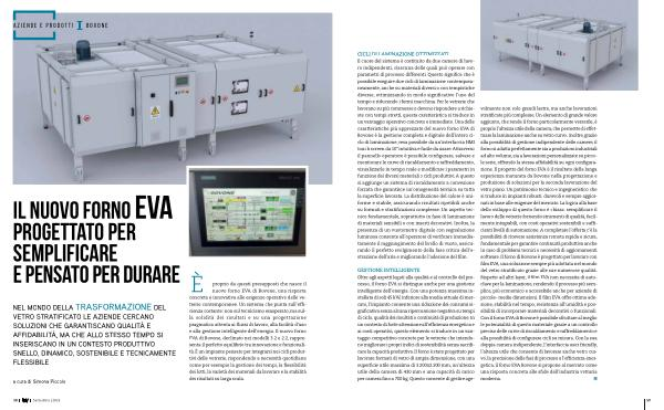 GESTIONE INTELLIGENTE Oltre agli aspetti legati alla qualità e al controllo del processo, il forno EVA si distingue anche per una gestione intelligente dell’ energia. Con una potenza massima installata di soli 45 kW, inferiore alla media attuale di mercato, l’ impianto consente una riduzione dei consumi significativa senza alcuna ripercussione negativa su tempi di ciclo, qualità dei risultati o continuità di produzione. In un contesto di forte attenzione all’ efficienza energetica e ai costi operativi, questo elemento si traduce in un vantaggio competitivo concreto per le vetrerie che intendono migliorare i propri indici di sostenibilità senza sacrificare la capacità produttiva. Il forno è stato progettato per lavorare formati di vetro di ampia dimensione, con una superficie utile massima di 3.200x2.200 mm, un’ altezza utile della camera di 430 mm e una capacità di carico per camera fino a 700 kg. Questo consente di gestire age- volmente non solo grandi lastre, ma anche lavorazioni stratificate più complesse. Un elemento di grande valore aggiunto, che rende il forno particolarmente versatile, è proprio l’ altezza utile della camera, che permette di effettuare la laminazione anche su vetro curvo. Inoltre, grazie alla possibilità di gestione indipendente delle camere, il forno si adatta perfettamente sia a produzioni industriali ad alto volume, sia a lavorazioni personalizzate su piccole serie, offrendo la stessa affidabilità su ogni configurazione. Il progetto del forno EVA è il risultato della lunga esperienza maturata da Bovone nella progettazione e produzione di soluzioni per la seconda lavorazione del vetro piano. Un patrimonio tecnico e ingegneristico che si traduce in impianti robusti, durevoli e sempre aggiornati in base alle esigenze del mercato. La logica alla base dello sviluppo di questo forno è chiara: semplificare il lavoro delle vetrerie fornendo strumenti di qualità, facilmente integrabili, con costi operativi sostenibili e sufficienti livelli di automazione. A completare l’ offerta c’ è la possibilità di ricevere assistenza remota rapida e sicura, fondamentale per garantire continuità produttiva anche in caso di problemi tecnici o necessità di aggiornamenti software. Il forno di Bovone è progettato per lavorare con film EVA, una soluzione sempre più adottata nel mondo del vetro stratificato grazie alle sue numerose qualità. Rispetto ad altri layer, il film EVA non necessita di autoclave per la laminazione, rendendo il processo più semplice, più economico e accessibile anche per aziende di piccole- medie dimensioni. Il film EVA offre ottima adesione, stabilità nel tempo, resistenza all’ umidità e possibilità di incorporare materiali decorativi o funzionali. Con il forno EVA di Bovone è possibile sfruttare al meglio le potenzialità di questo materiale grazie a un controllo preciso delle curve di riscaldamento e raffreddamento e alla possibilità di configurare cicli su misura. Con la sua doppia camera indipendente, l’ interfaccia user friendly, l’ altezza utile che consente di lavorare anche vetro curvo, la precisione delle fasi di processo e l’ efficienza energetica, il forno EVA Bovone si propone al mercato come una risposta concreta alle sfide dell’ industria vetraria moderna.