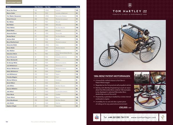 Oliver Wentworth 298 1904 M. M. C. 103 Sir George White 232 1903 Panhard-Levassor 96 Josh Whittemore 154 1903 Oldsmobile 87 Richard Whittemore 238 1903 Panhard-Levassor 96 Kelsie Whittemore 318 1904 Peugeot 106 Jack Whittemore 354 1904 Napier 110 Timothy Wiggins 333 1904 Ford 108 Michael Williams 112 1902 Delahaye 81 Derek Wilson 116 1902 Bolide 82 John Wilton 22 1899 De Dion Bouton 70 Duncan Wiltshire 91 1901 Mors 80 John Winer 51 1900 Locomobile( steam) 73 Peter Wood 177 1903 Cadillac 89 Trevor Wood 337 1904 Bayard 108 Chris Woodhouse 256 1904 De Dion Bouton 98 John Worth 52 1900 Daimler 73 Stephen Wright 259 1904 Napoleon 98