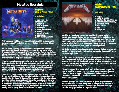 The album is almost perfect, it’s not repetitive, each track is unique and has its own absolute identity. There are speed, melody and complexity without reaching density, fitting all the atmosphere created for the disc, where these musicians are free to develop their full potential to create songs that have become indispensable as "Hangar 18", "Take No Prisoners", "Tornado of Souls ", "Holy Wars" or "Five Magics" and its spectacular introduction. Maybe it is not the most powerful album in Thrash metal, but the disk has the highest quality, thus becoming the definitive album of the genre.