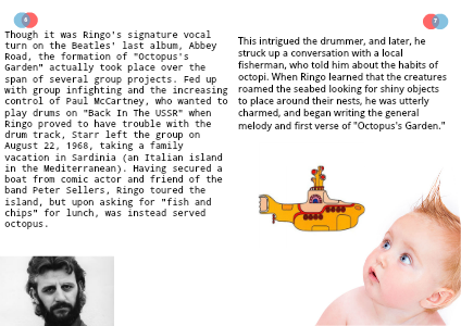 Though it was Ringo's signature vocal turn on the Beatles' last album, Abbey Road, the formation of "Octopus's Garden" actually took place over the span of several group projects. Fed up with group infighting and the increasing control of Paul McCartney, who wanted to play drums on "Back In The USSR" when Ringo proved to have trouble with the drum track, Starr left the group on August 22, 1968, taking a family vacation in Sardinia (an Italian island in the Mediterranean). Having secured a boat from comic actor and friend of the band Peter Sellers, Ringo toured the island, but upon asking for "fish and chips" for lunch, was instead served octopus.
