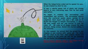He began to examine the surroundings with astonishment and curiosity . The surrounding objects were like scattered puzzle pieces waiting to be completed . Each object also had a QR code on it . Rocket Kid thought to himself “ Fortunately , I have a QR code reader with me ” and started to scan the codes . All QR codes on all shapes showed the same direction . Being curious , Rocket Kid started walking in this direction .