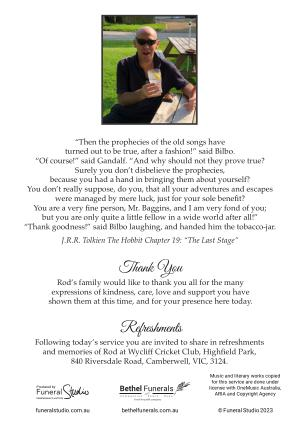 Following today ’ s service you are invited to share in refreshments and memories of Rod at Wycliff Cricket Club , Highfield Park , 840 Riversdale Road , Camberwell , VIC , 3124 .