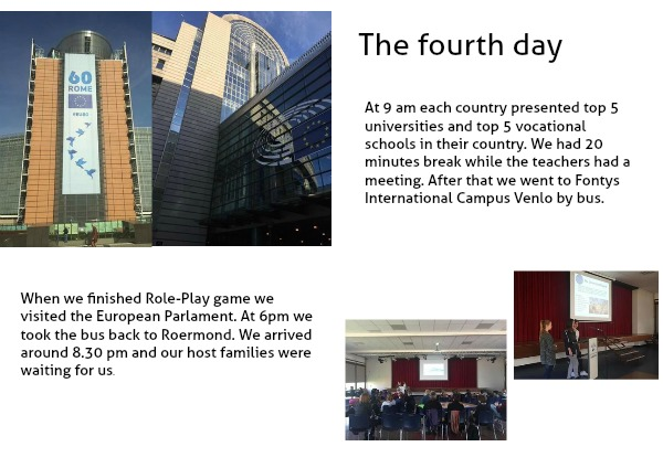 When we finished Role-Play game we visited the European Parlament. At 6pm we took the bus back to Roermond. We arrived around 8.30 pm and our host families were waiting for us.