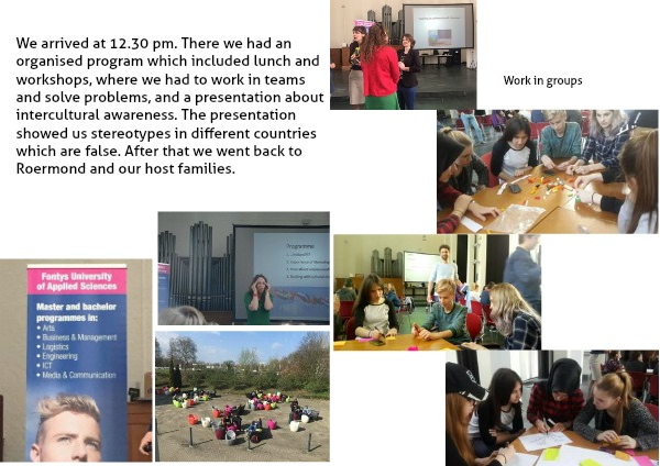 We arrived at 12.30 pm. There we had an organised program which included lunch and workshops, where we had to work in teams and solve problems, and a presentation about intercultural awareness. The presentation showed us stereotypes in different countries which are false. After that we went back to Roermond and our host families.