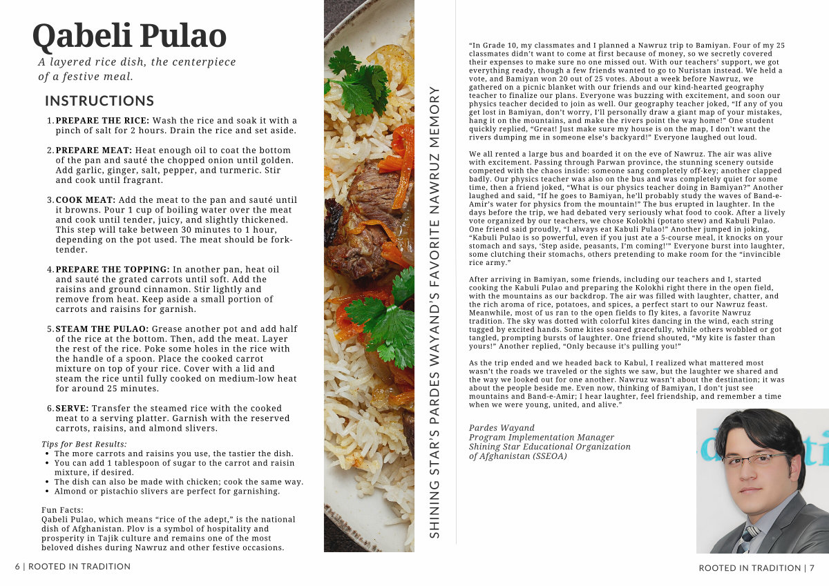 Fun Facts: Qabeli Pulao, which means“ rice of the adept,” is the national dish of Afghanistan. Plov is a symbol of hospitality and prosperity in Tajik culture and remains one of the most beloved dishes during Nawruz and other festive occasions.