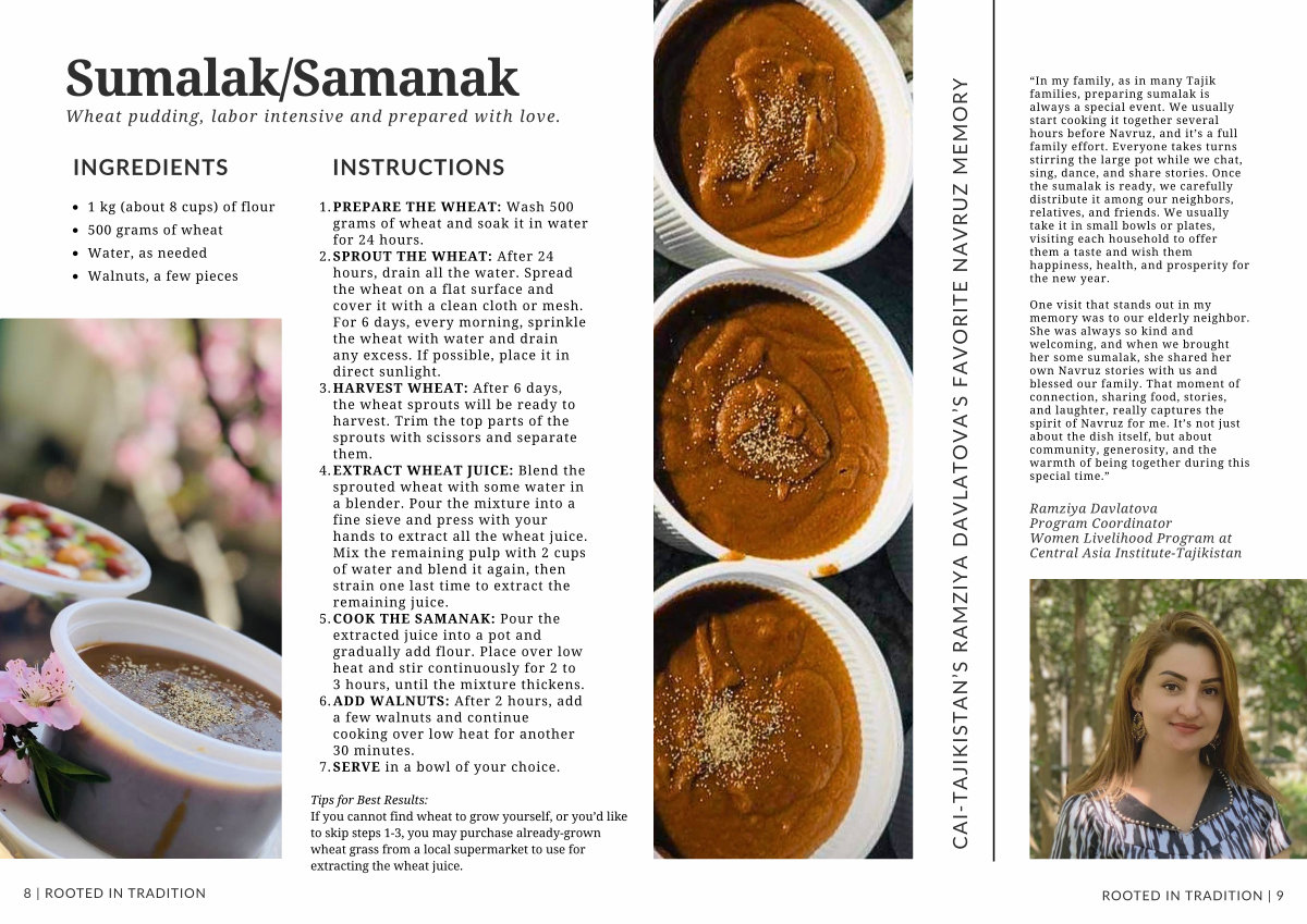 “ In my family, as in many Tajik families, preparing sumalak is always a special event. We usually start cooking it together several hours before Navruz, and it’ s a full family effort. Everyone takes turns stirring the large pot while we chat, sing, dance, and share stories. Once the sumalak is ready, we carefully distribute it among our neighbors, relatives, and friends. We usually take it in small bowls or plates, visiting each household to offer them a taste and wish them happiness, health, and prosperity for the new year.